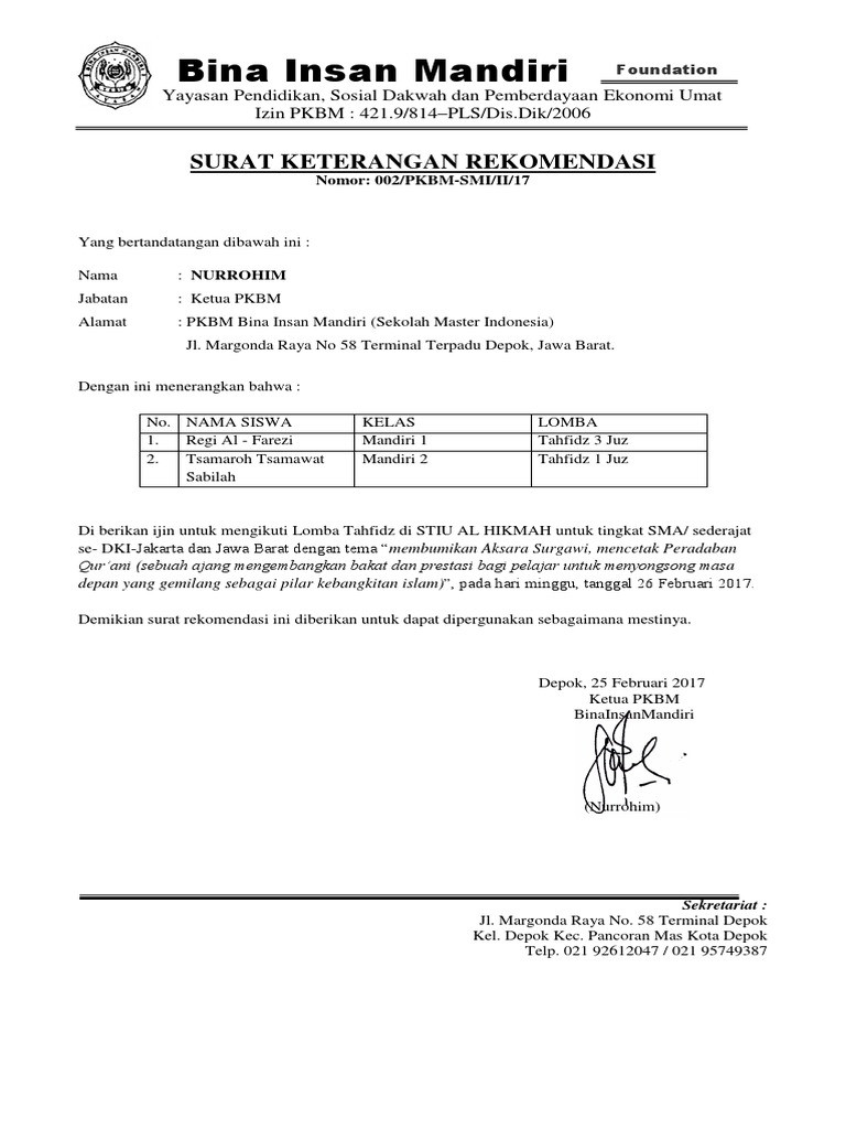 Data orang yang merekomendasikan/ atau di. Surat ini dibuat berdasarkan penilaian kapabilitas dan kinerja si pembuat surat atau pemohon. Selain mempermudah, surat rekomendasi juga. Mulai dari lisan hingga tulisan. Penggunaan surat rekomendasi peranannya cukup penting digunakan bagi sejumlah orang untuk kelancaran suatu kegiatan yang akan dijalankan.